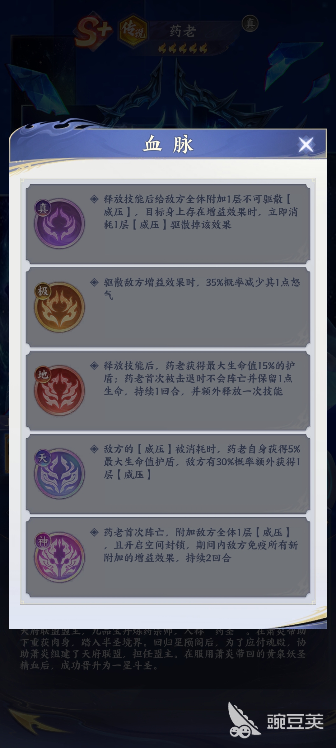 而对于玩家来说,药老的核心机制是驱散和封锁,他的天赋跟血脉主打的就是围绕驱散展开,一旦形成之后,能够有效的克制整个队伍的增益作用,并且封锁再一次提高了控制效果。所以对于大部分玩家来说,当他们熟悉了药老的整个技能特点之后,想要将药老发挥出关键的实力。这时候玩家就需要尽可能的去提高他的天赋跟血脉系统。