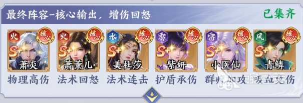 美杜莎+小医仙+紫妍+萧薰儿+青鳞+萧炎:这一个阵容主要是将防御续航输出结合在一起,就成为玩家登顶斗破苍穹的终极选择。萧炎这就是物理性的高伤核心,在队伍中就是绝对的输出主力,在真伤的光环下就可以爆发强大的伤害力。萧薰儿则是法术回怒角色,可以迅速的给全队积攒怒气,让核心技能就可以无缝的衔接在一起。加上小医仙的群聊辅助攻击,能迅速的提升全队的输出以及续航能力。