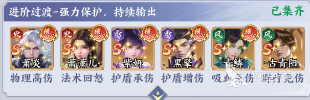 紫妍+黑擎+青鳞+萧薰儿+萧炎+古青阳:在这一个阵容中,作为主要输出点的就是萧炎,具有物理高伤核心,在护盾的保护下就可以稳定的输出。萧薰儿则是法术回怒角色,能迅速的给队友积攒怒气,让核心技能在释放的时候更加的频繁。古青阳具有群疗免伤的技能,可以有效提升队伍的生存能力,在持续作战的过程中没有后顾之忧。这套阵容主要是以护盾作为核心,可以打造攻防一体的体系,在面对高爆发的敌人时,始终都可以稳如泰山。