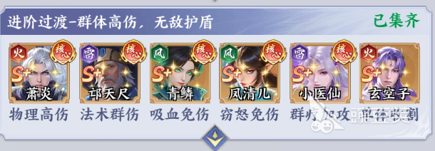 萧炎+ 邙天尺+青鳞+小医仙+玄空子+凤清儿:萧炎这就是物理高山的核心,配合邙天尺的法术群伤。就能有效形成双核心爆发,在短时间内就能清理敌方群体。青鳞拥有吸血免伤的特性,在群体输出的过程中就能保存自身的生存,拥有持续性输出的效果。玄空子则是单体收割角色,在群体爆发之后,就能有效收割残血,终结战局。