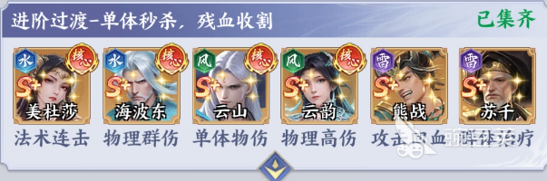 美杜莎+云山+海波东+云韵+苏千+熊战:这一套阵容是通过精准的单体爆发,迅速的瓦解敌方的核心,然后配合残血收割,让玩家在中期PVE还有PVP中就能够游刃有余。美杜莎就可以继续承担法术连击的核心输出,配合海波东的物理群伤,就能迅速的清理敌方的残兵。云山则是单体物理性伤害天花板,可以精准的锁定敌方核心C位。具有一击毙命的效果。云韵则是物理性高伤角色,在云山秒杀核心之后就能迅速的收割残血,扩大战果,把这些角色放在一起,那自然就会拥有更好的优势。