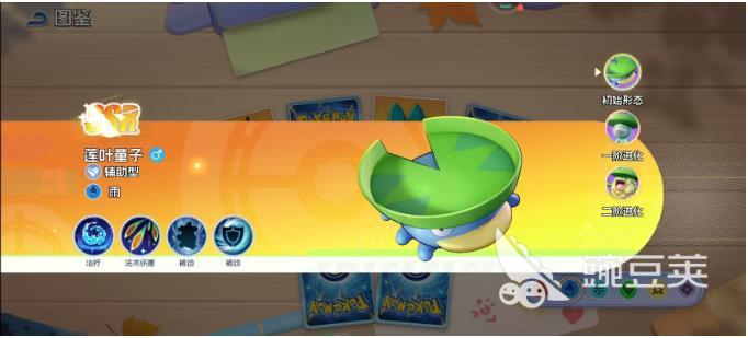 莲叶童子一开始头顶会有一片翠绿的叶子,但是此时就能够展现出辅助的天赋。作为一个拥有雨属性的辅助型精灵,他的技能早就已经点亮法术伤害还有治疗,两个被动技能可以给后续的进阶直接埋下伏笔。此时的他就好像是刚刚进入到战场的新手,虽然没有具备强大的辅助能力,但是却用基础的治疗技能给所有的队员续航始终都会承担着守护的作用。