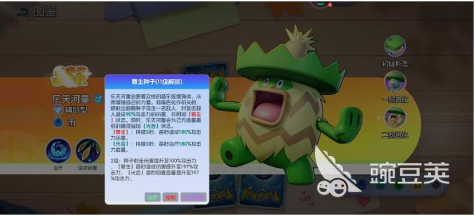 在最后进阶之后就会变成乐天河童 ,这就是一个全能辅助的终极形态。此时头上的帽子就出现了变化,作为一个二阶进化的形态。他的辅助能力就会进入到巅峰的状态,尤其是11级解锁的核心技能,就会让他在团队中成为一个无可替代的存在。这一个技能就可以让他的嘴巴直接变成机关枪,一下子就可以喷射出好几颗种子,然后攻击敌人,不仅可以造成高额的法术伤害,同时还会拥有寄生的状态,可以持续针对敌人去造成伤害。能达到持续治疗队友的作用,在团战的过程中是拥有多重优势的,难怪被称之为全能辅助大师。