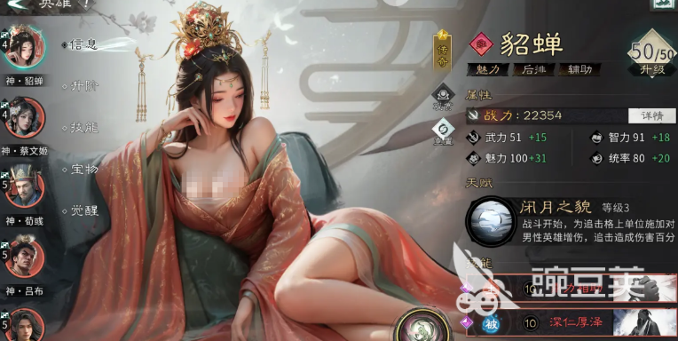 以上就是三国天下归心貂蝉这个角色的详细介绍了,小伙伴们在使用貂蝉之前,需要先对这个武将做一个详细的了解才行,只有清楚的知道貂蝉的技能效果,才能组建出更加合适的阵容。