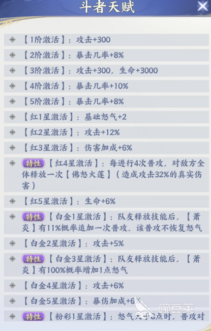 比如他在后期激活了自身的天赋能力之后,每次普攻之后还可以释放一次佛怒火莲的机制,这个机制也可以让他带来更多的真实伤害效果,同时在降低对面防御数值的情况下,他的特性同样也是可以对敌人产生一定破防的效果,所以对于一些需要物理穿透效果的角色来说,萧炎他绝对是非常适合大家操作的角色,那么在前期通过他的特性激活了这类效果的话,可以造成的真实伤害百分比也达到了32%的数值,而在后期萧炎的特性通过不同的星级进行提升的话,还可以带来更多的追加攻击,虽然施加的攻击是普攻,但是他的普攻在有怒气加成的情况下,同样也是很好用的。