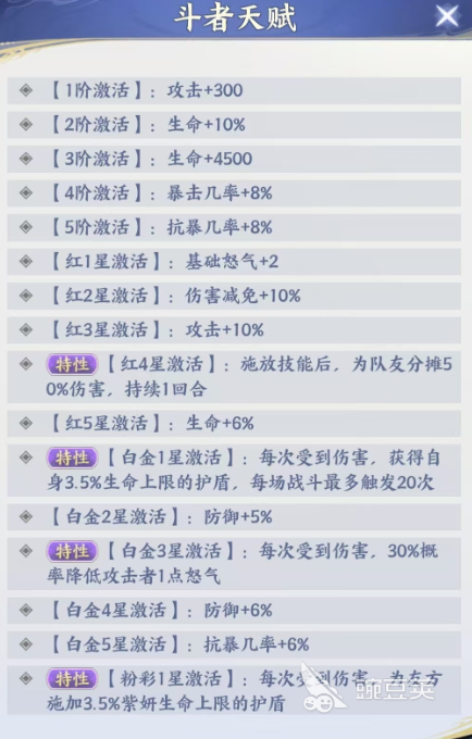 同样在这个太虚拳的初始技能当中,紫研除了基础的伤害数值之外,同时可以根据自身的生命数值带来70%的护盾,在后期持续两个回合的时间当中,都是可以给自身带来一定的保的护,所以放在游戏当中这个技能是她整体战术的一个核心用法,后期在天赋可以进行加成的情况下,带来的关键能力也会更多一些,在天赋升星的时候,她前期的五阶几乎基本都是带来的生命,还有暴击以及抗爆上面的百分比加成,而后期达到红星激活的话也是有怒气增加以及界面效果的,当然紫研最高一个特性的效果在触发的时候是在红色星进行激活,在释放技能之后,她达到红四星强度就可以为队友分担50%的伤害了,虽然只有一个回合,但是这个技能针对我方的一些脆皮输出角色来说绝对是非常需要的,而另外紫研达到白金一星的时候,可以激活的能力是每一次受到敌人伤害,她就可以获得自身3.5%的生命上限护盾效果,放在这里的话紫研可以带来的护盾虽然比较低,但是这个能力是在每场战斗当中可以触发到20次的,所以在叠加起来之后,这个角色能够带来的护盾也是非常高的。