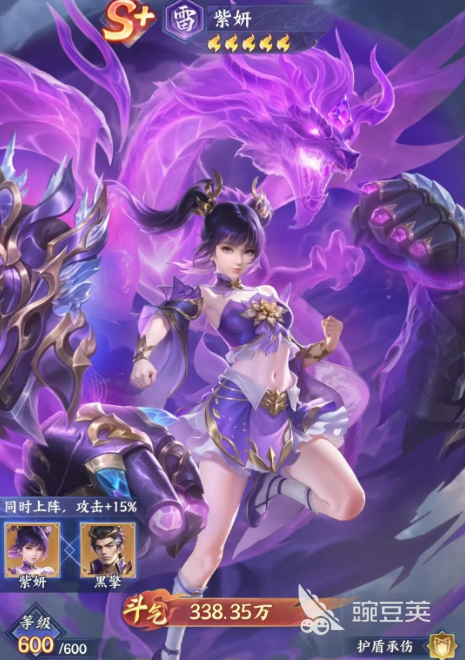 另外在达到了白金三星之后,她触发的天赋效果就变成了每一次受到伤害之后,还有30%的概率可以降低攻击对手身上的一点怒气,所以敌方如果是以怒气来进行输出的话,那么紫研的这个天赋就非常有用了,最后是在粉彩一星的情况下,如果激活了她的特性,那么每次紫研受到对面伤害的时候,她都会为队友施加3.5%生命上限那个护盾,所以此时她不仅可以给自身带来护盾防御也可以给队友带来一部分的防御效果,因为紫妍她自身的话在防御效果上面更出色,所以这些输出能力没有那么高,这里如果要组建这种效果的话,大家就要注意其中的协同性够不够达到多方面的增益,比如这里主要的输出位置,大家就可以放萧炎,保证有足够的物理输出,萧薰儿同样也可以带来群体的回复效果,在这里也可以保证紫妍的技能效果可以快速循环起来,然后搭配美杜莎跟小医仙,这样的话,整体的辅助都完全可以补充起来,青鳞同样也是可以在这里跟紫研放在一起进行使用,他们双重的伤害分担以及被动的护盾都可以覆盖到整体需要的生存能力,最后就是上面说到的黑擎,他在羁绊产生了之后上阵,就可以给全队都带来输出提升。