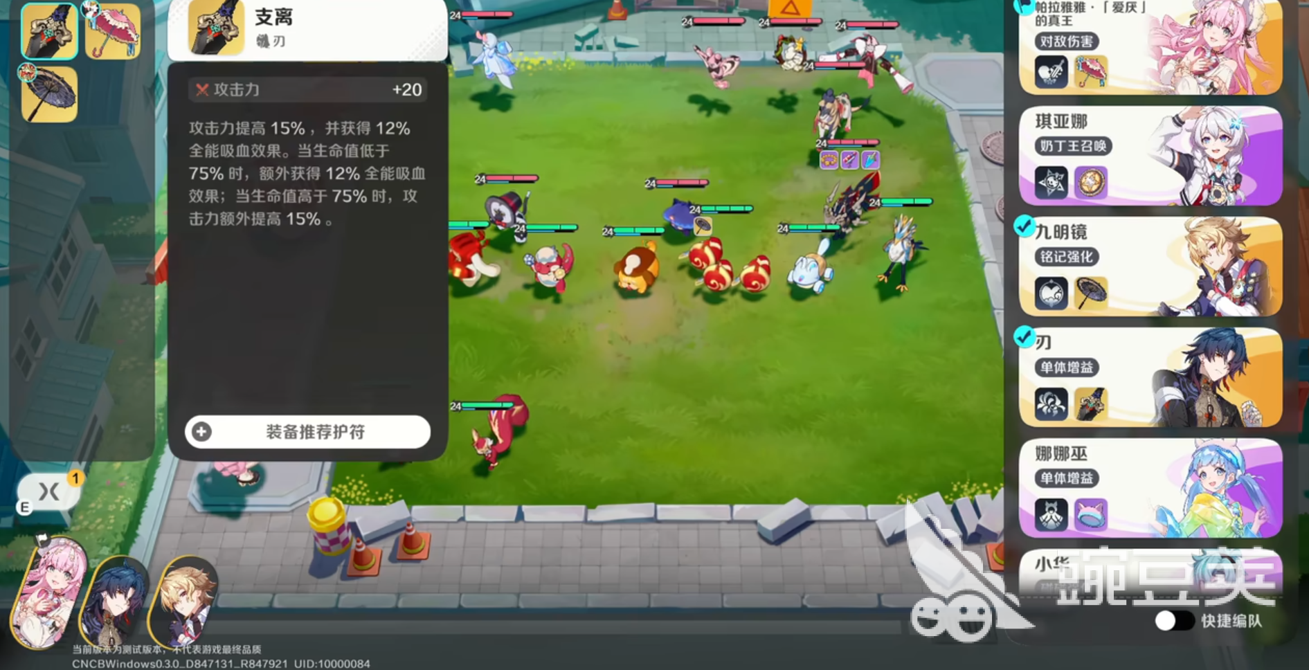 在实战中,我们将刃的法则送到前排的精灵身上,这样能让我们的前排角色直接多一条命,无论是在前期过渡来用还是中后期打辅助效果,刃的这个技能可以说是都非常至关重要,而其专属的护符“支离”则更是让我们的精灵生存能力直接提升24%!其效果是“提升15%攻击力,获得12%的全能吸血,生命值高于75%时,再翻一倍。”,再搭配上刃的法则,可以说想让我们的精灵被集火秒掉基本上是不可能的。小编这里推荐小伙伴们在使用刃的时候尽量交给前排大C或者后排大C位,刃的“支离”有着近24%的全能吸血加成可以说是相当慷慨的数值了,但在血量保持不到75%的时候可能略显平庸一些,小伙伴们这点一定要注意,尽量保持自己的精灵处于高血量状态,这里小编推荐小伙伴们在使用刃的“支离”的时候,尽量将其交给血量够高,且自身有恢复手段的角色,要不然低于75%血量之后,我们亏的输出就太多了,直接是损失一半的加成。
