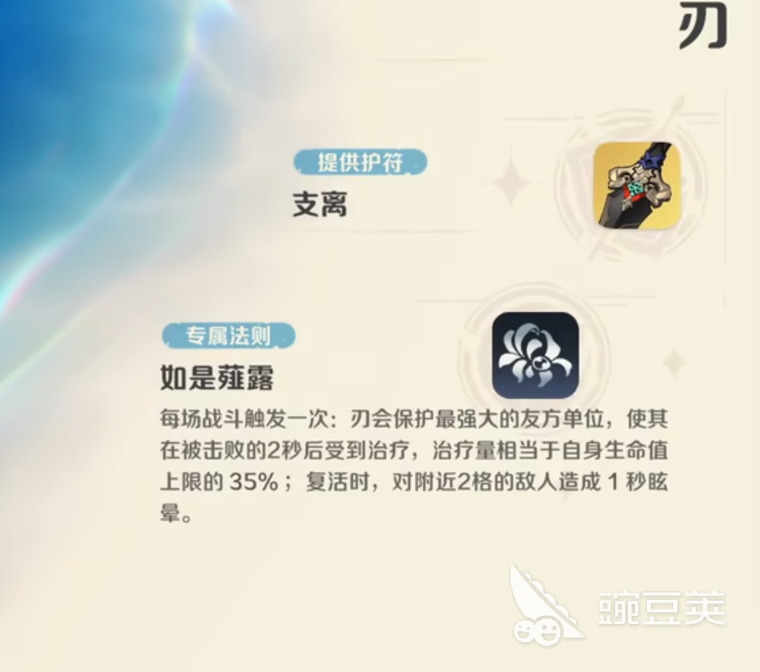 在游戏中,刃一共有两个专属的道具与技能,其中最为核心的当属刃的法则“如是薤露”,其效果为“每场战斗触发一次:刃会保护最强大的友方单位,使其在被击败的2秒后受到治疗,治疗量相当于自身生命值上限的35%:复活时,对附近2格内的敌人造成一秒眩晕”。也许小伙伴们会觉得这个法则并不算强,只是单纯的能复活而已,对于那些能提升输出的法则来说可能并没有那么亮眼,但小伙伴们千万不要忘记了!刃的技能是给到“最强大的友方单位”,而这个最强大则专门指到的是我们进阶等级最高的精灵。这让我们无论是在前排还是后排输出的精灵,都能有一条复活甲的保障,而且在复活之后还会对周围敌人造成一秒的眩晕,无论是辅助性还是功能性,刃的这个专属技能都可以说是强度拉满!妥妥的T0级别技能!