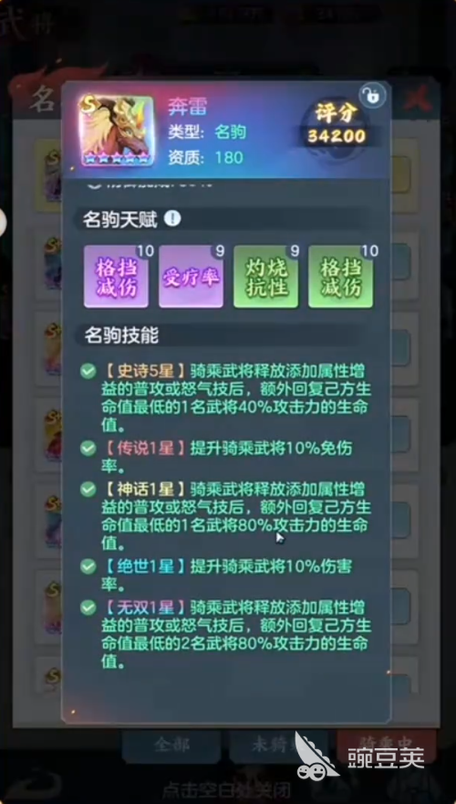 坐骑系统在本模式中实现完全开放——所有名驹均无需资源解锁,可自由切换搭配。“彩色奔雷”因其独特的复合型被动效果成为首选:提供格挡率加成、受击减伤、治疗效果提升及额外治疗触发概率四项关键属性,显著增强队伍整体续航韧性与容错空间。其成长曲线平滑,属性加成幅度稳定,长期培养收益明确,是构建稳健阵容的重要支点。