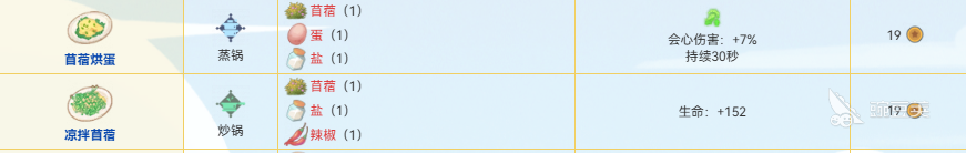 首先是一些比较基础的食物配方,这类配方食材比较好获取,大家解锁起来也比较简单,其实也是前期最容易做的,比如番茄炒蛋只需要番茄加鸡蛋再加盐就能做,材料简单还好获取,前期恢复体力特别实用。酸辣土豆丝则是土豆搭配醋和辣椒,口感是酸酸辣辣的,不管是自己吃还是送给喜欢辣味的NPC都很合适。凉拌苜蓿:需要大家先用用苜蓿加盐和辣椒就能完成,前期采集到苜蓿就能做,是很省心的一个快速料理,前期很多玩家都会做这个菜肴。糖炒板栗:只需要板栗和糖两种材料,不管是日常充饥还是送礼都不错,其中的板栗这个材料在野外也能轻松捡到,糖大家是可以去购买的。