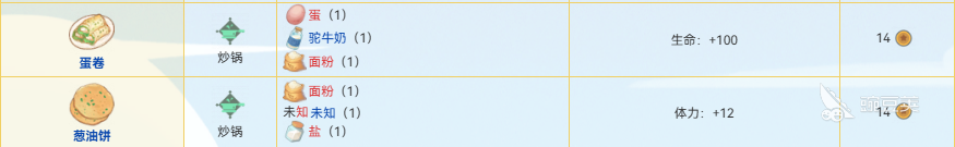 除了一些前期比较简单就可以解锁的食谱之外,其实游戏当中的面食类的食谱是最为丰富的,大家可以综合出来多种面食类的食物,比如这里的葱油饼,大家用面粉、沙葱和盐制作,是前期很常用的主食,做完食用的话角色的饥饿度会更快回升。奶香板栗:需要驼牛奶、板栗和糖,恢复效果也更好,适合中期高强度劳作之后吃,或者是大家需要去采集之前也可以补充一些。蛋卷:需要用到鸡蛋加驼牛奶再加面粉,做法也是比较简单的,属于跑图场景当中比较好用的料理。蛋包饭:需要鸡蛋、米以及酱油,有饭有蛋,恢复体力的速度也很快,日常做几份带在身上很方便,特别是大家任务比较多的时候更需要。