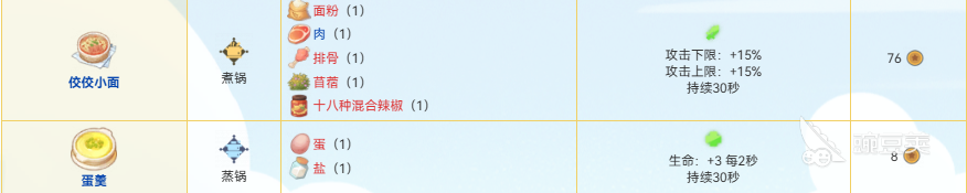 另外大家如果用的各种调料比较多的话,在这里其实可以用到的恢复效果会更好,比如糖醋排骨:大家可以用排骨、糖和醋制作,是中期很不错的食物,提升NPC好感也很合适。咸蛋蒸肉饼:需要肉还有米,然后加一点酱油,下矿之前大家就可以吃一个再去。蛋羹:只需要鸡蛋和盐,做法最简单,前期缺食材的时候做这个最划算。牛奶蒸蛋:是驼牛奶加鸡蛋,比普通蛋羹恢复效果更好,材料也不难凑。肉包子:用肉、面粉和沙葱制作,是很经典的主食,前期做一堆备用完全够用。