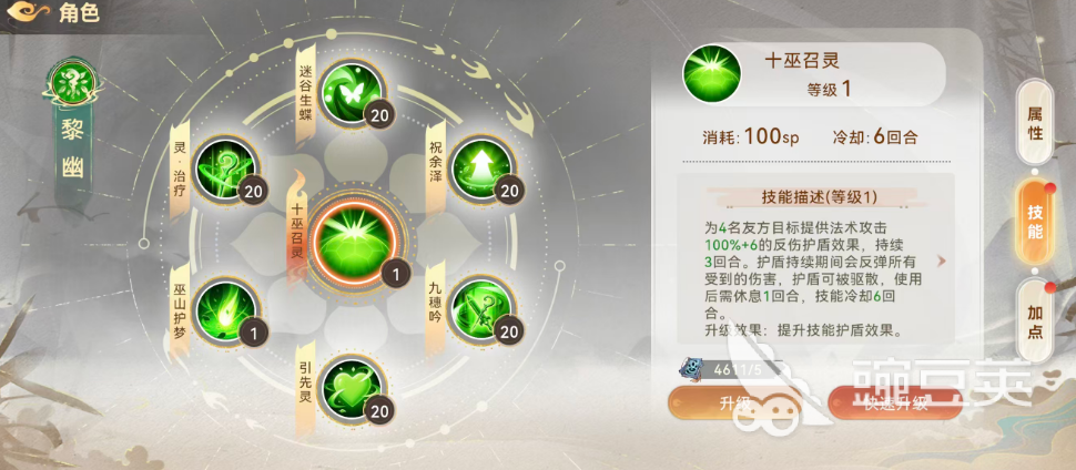 九穗吟放在群体效果当中用的时候,黎幽可以主动释放出去,为4名友方目标增加8%+94点物理攻击和法术攻击,持续4回合的时间还是很长的,而且后期在技能加成的数值上面也是比较可观的。最后就是相当于黎幽的主动技能了,这个技能当中大家可以看到黎幽消耗法力数值最大的一个技能效果,需要消耗100点菜可以使用出去,黎幽此时可以为4名友方目标提供法术攻击100%+6的反伤护盾效果,这里的护盾持续期间会反弹所有受到的伤害,护盾可被驱散,就是使用后需休息1回合,技能冷却时间也是长达了6回合,在一些短时间作战当中有可能是只有一次使用机会的。