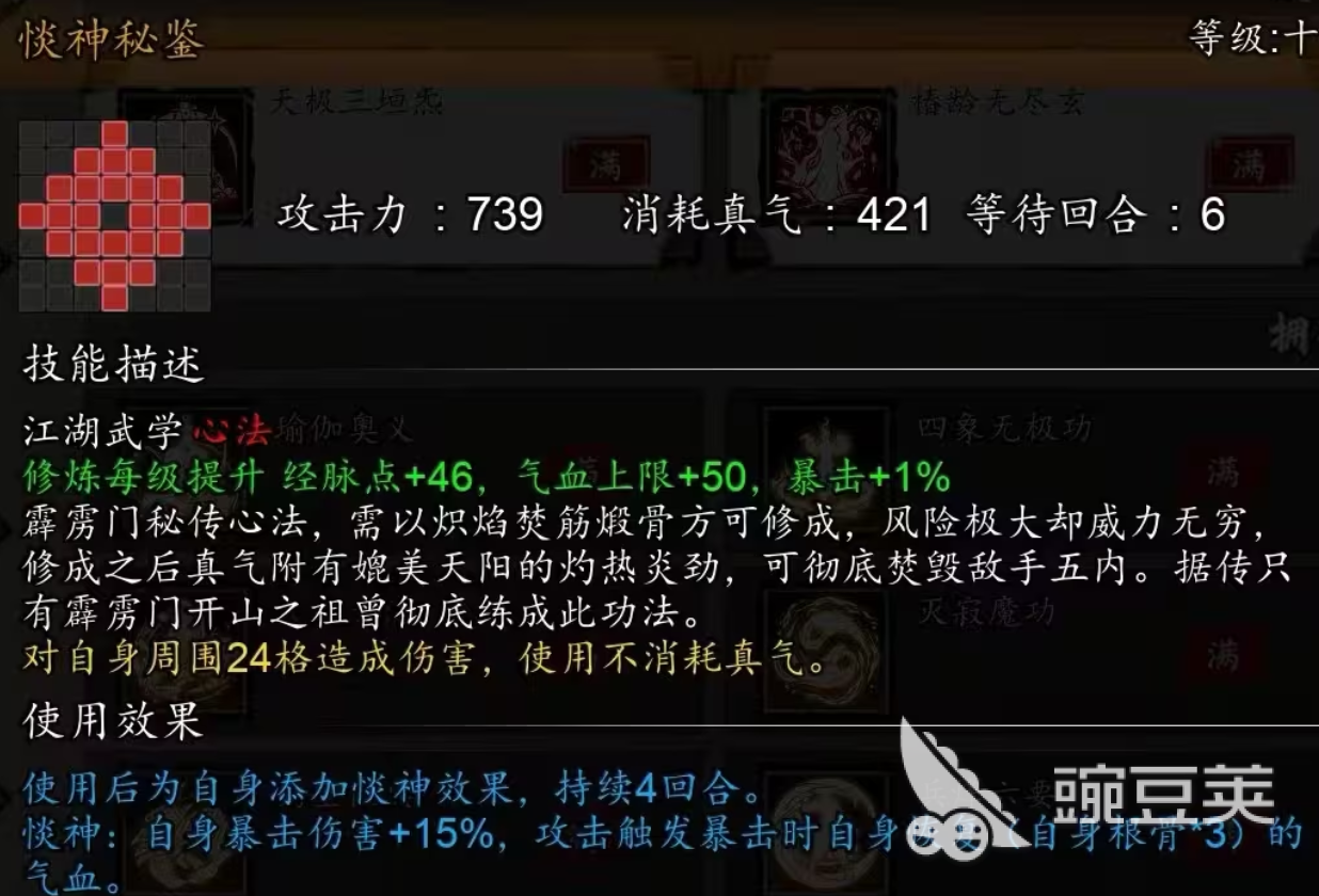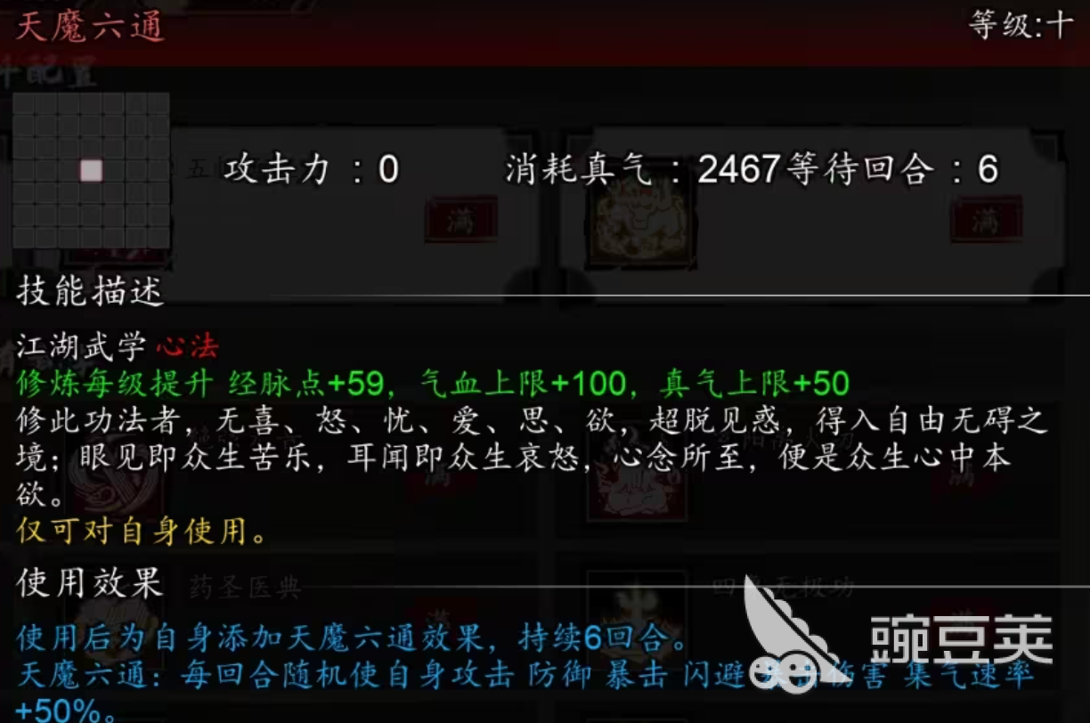 就心法来说,天魔六通同惔神秘鉴、五恒天经相配,几乎不可能有其他合适的搭配。惔神秘鉴的特殊之处在于暴击之后会降低心法冷却时间,和多段技能配合效果很好,使技能循环几乎无限延长。加上五恒天经的辅助后,在游戏里可以同时输出高额生命值和操作灵活度,可以应付复杂的环境。经由心法的配合,整套组合的爆发和续航完美融合在一起,为后面招式的衔接打下了基础。