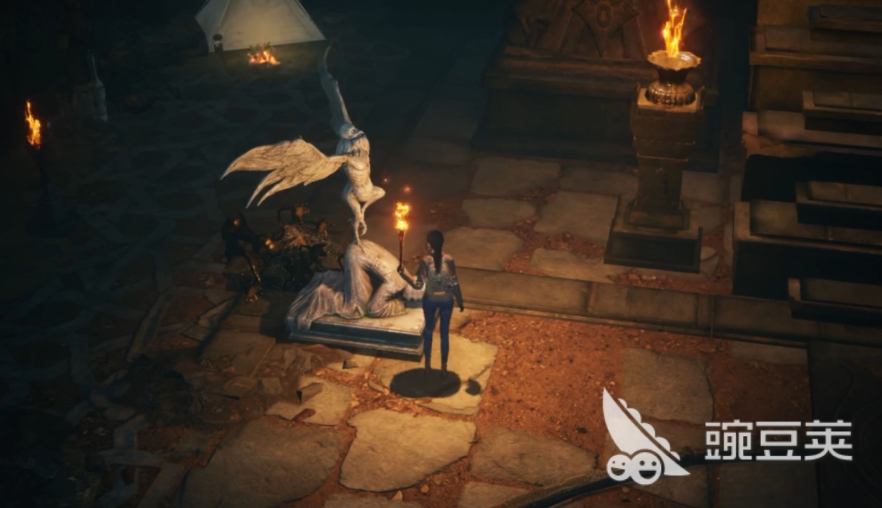在营地里恢复好后,继续往前来到巨大雕像所在地,在一段剧情后与巨大雕像旁边的四个小雕像交互,将它们都更改成头伏低下来的形态,便能解锁机关继续向前。此时玩家们只要走上高台,与黄金座椅交互,就会进入一段CG剧情,原本的巨大雕像也将活过来与玩家进行战斗。此战难度不是很大,玩家只要注意多留些加血技能在关键时刻使用,那么在角色练度正常的情况下就能较为轻松地解决掉这一个boss。完成战斗后,玩家们便完成了对西王母宫的探索,可在拿完地图里的宝箱后离开。