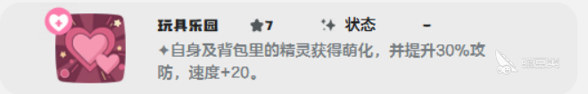 第二关键技为【玩具乐园】。此技能为团队型增益技,释放后可使己方全体精灵获得萌化状态,并同步提升防御30点、速度20点。该加成对萌系阵容具有显著协同价值,尤其适用于预组多只萌系精灵的战术体系。实战中常采用“先开乐园→立即接撒娇”的连动节奏,确保萌化状态无缝衔接,最大化输出窗口。