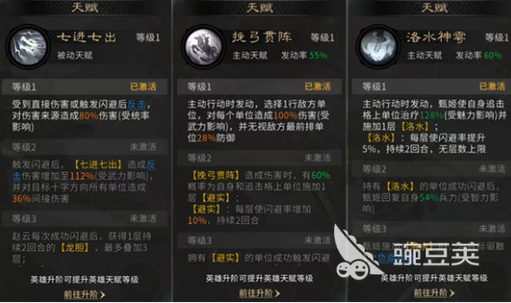 赵云的主动技能就会带着历战之躯。不仅可以增加闪避,还可以嘲讽三个敌人,把所有的伤害全部都拉到自己的身上。而且统帅越高,闪避加成也就更多,在培养时就可以侧重于这一个属性。太史慈就是阵容中的闪避辅助,还有副输出,在打全体伤害时,还可以给敌方挂一个溃逃的技能。让对面回合开始掉血,此时就可以进一步的强化核心的优势。除了武将搭配之外,天赋的激活同样也会比较重要。甄姬的洛水神雩可以给赵云增加闪避,还可以在赵云闪避之后回血清理负面的效率。