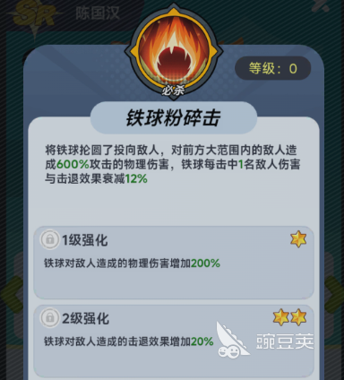 陈国汉的主要优点就在于战术功能性,还有承伤能力。前排坦克的定位就可以让它有效支撑敌方的主力伤害,星级进阶之后解锁的抗击退机制,就能让他压制敌方的位置移动,有效控制好阵型,给后排的输出创造出更安全的输出环境。他的技能组设计将坦度还有功能性全部的拉满。必杀技能就可以针对前方大范围的敌人造成高额物理性伤害。在四级强化之后释放技能,还可以获得高额的击退抗性以及伤害减免。