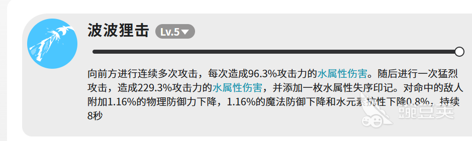 说回技能部分,波河狸一共有四个技能,分别是波波狸击、水弹、泡泡攻击和破碎激流。波波狸击是主要的输出手段。满级之后,它会先向前方连续打出多次攻击,每次造成96.3%攻击力的水属性伤害。连击结束之后,还会跟上一次重击,这一下伤害直接跳到229.3%攻击力,同时给目标加上一枚水属性失序印记。除了伤害之外,命中的敌人还会被附加减益效果,物理防御和魔法防御各下降1.16%,水元素抗性也会降低0.8%,这些效果持续8秒。单看数字可能觉得降幅不大,但在实际战斗里,配合队伍里其他水属性角色一起打,叠起来的效果还是挺明显的。