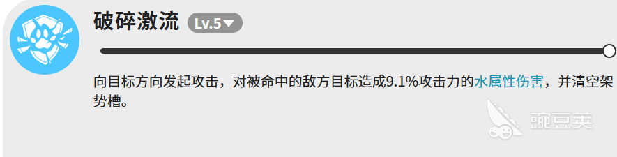 破碎激流这个技能比较特殊,伤害倍率只有9.1%,看起来很低,但它的作用不在于伤害本身。这个技能命中之后会直接清空目标的架势槽,这个效果在面对一些靠架势槽维持状态的敌人时,用处非常大。可以说是一个功能性技能,不能单纯用伤害数字来衡量它的价值。
