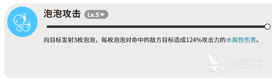 泡泡攻击的手感和水弹有点像,但伤害差距挺大的。同样是发射三枚,不过每枚泡泡命中之后造成的伤害是124%攻击力,比水弹高出不少。三枚全中的话,总伤害还是相当可观的,算是波河狸技能里比较稳定的一个输出来源。