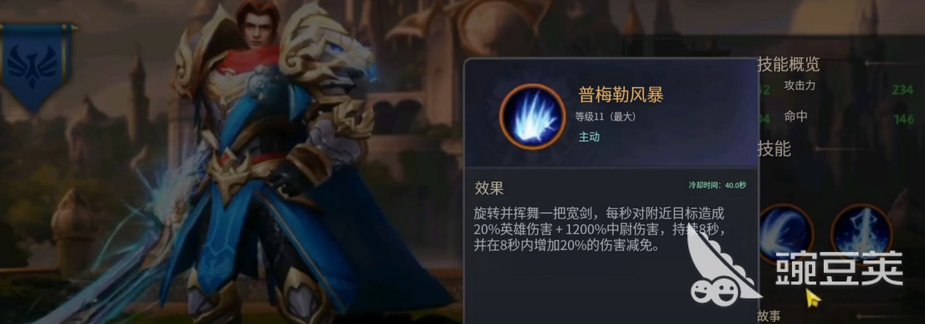 从技能角度出发,查理爵士的主动技能“普梅勒风暴”体现的是他作为抵抗军领袖的狂战士一面。等级11满级的时候该技能冷却时间为40秒,查理爵士挥动宽剑的时间为8秒,对周围的敌人都会带来20%的英雄伤害以及1200%的中尉伤害。更重要的是在这8秒钟内,还能得到20%的伤害减免。这就意味着他输出强度高时自身坦度也会提高,完全符合他浴血奋战的背景故事,在怪物群中既能抗又能打。