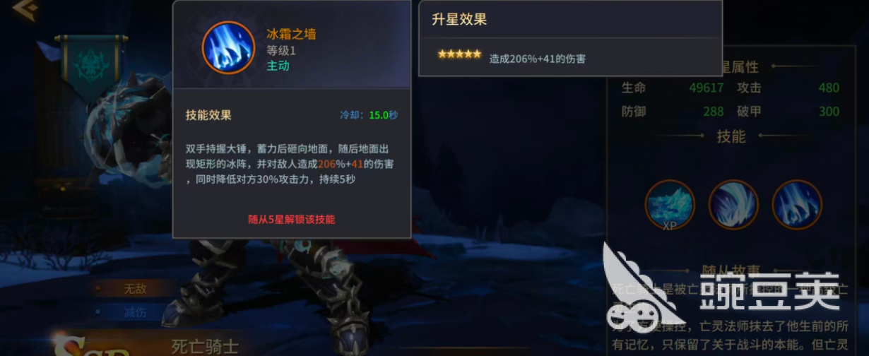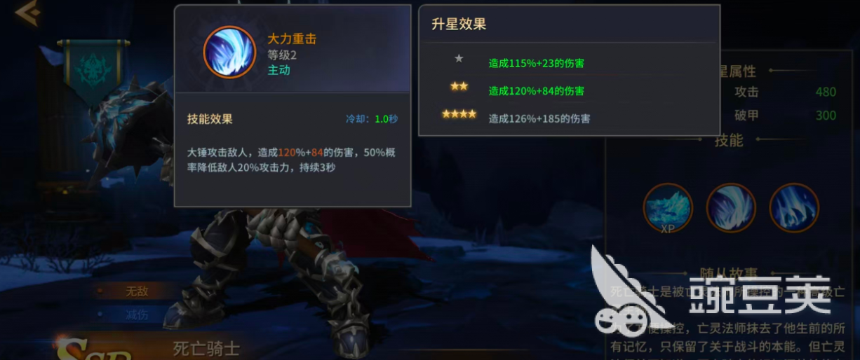 从实战定位来说,死亡骑士很好地完成了团队前排承伤和敌方压制的双重任务。第一技能“大力重击”挥动巨大的战锤进行范围攻击,基础伤害随着星级的提高而明显增大,更难得的是可以稳定地触发50%几率的攻击力削弱效果,使目标攻击力降低20%,持续3秒。减损的效果不会因为星级的变化而降低,在高难度的副本中也能够有效地削弱Boss的输出,给后排创造了一个安全的输出空间,对于团队生存来说具有非常重要的意义。