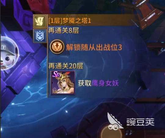 因为楼层越来越多,所以梦魇之塔的奖励也越来越高。按照规则,玩家通关第1层之后,如果再连续通关8层(即累计到第9层左右),那么系统就会解锁至关重要的随从出战位3。解锁之后玩家队伍就会由原来的两个人或者一个人作战变为三人共同作战,战术组合也变得十分繁杂,可以应对更加复杂的战场情况。当玩家用毅力和智慧通关到第20层的时候,就会得到SR级强力伙伴鹰身女妖作为最终的奖励。