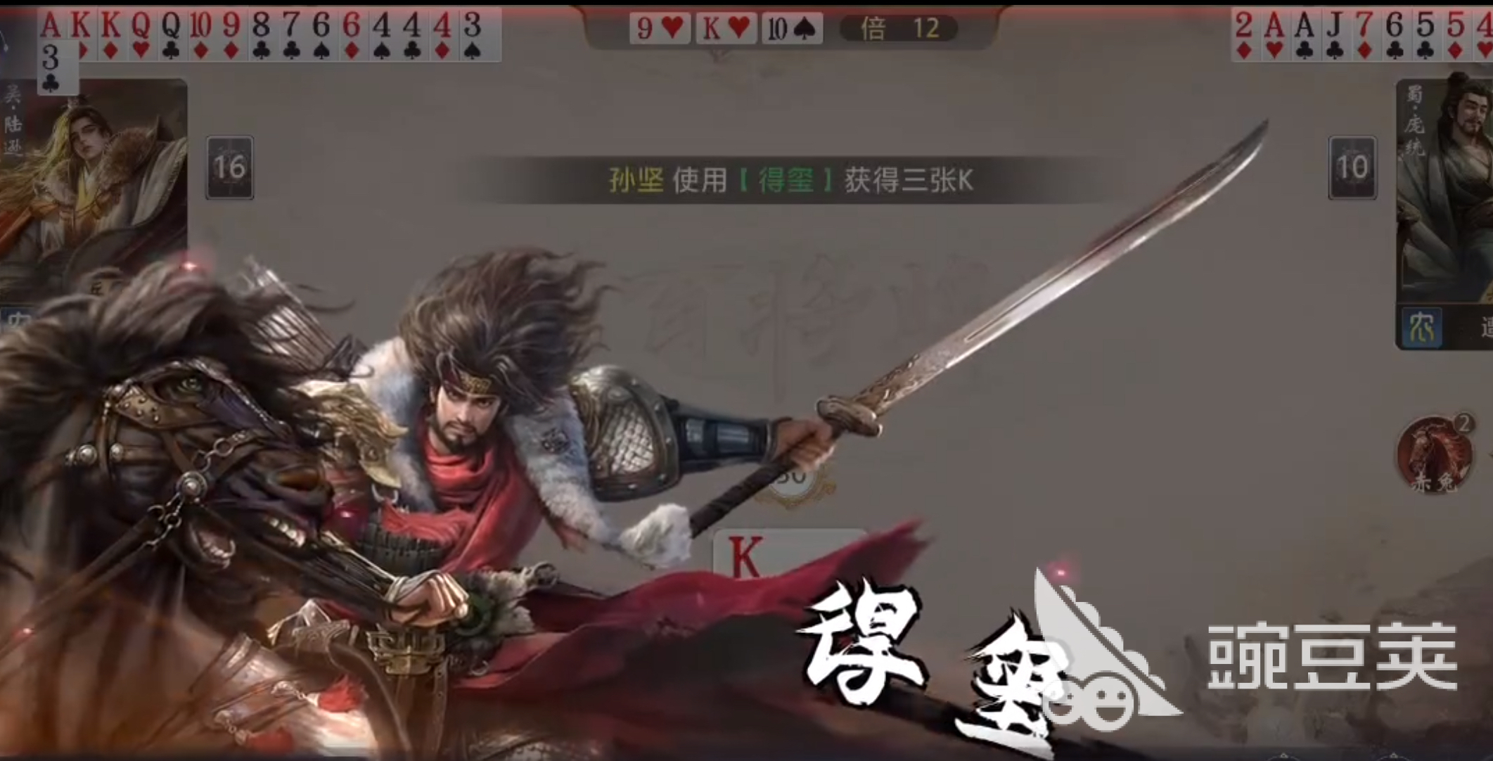 孙坚在游戏中是属于吴国阵营的武将,他的技能名是“得玺”,技能效果是当我们手牌中没有三张和炸弹的时候就会获得3张K牌,这就意味着只要有孙坚在场的局那么必然会有1个K牌炸弹的。所以想要玩好孙坚的话,我们的核心思路就是留k凑炸,炸翻全场,拿下胜利!