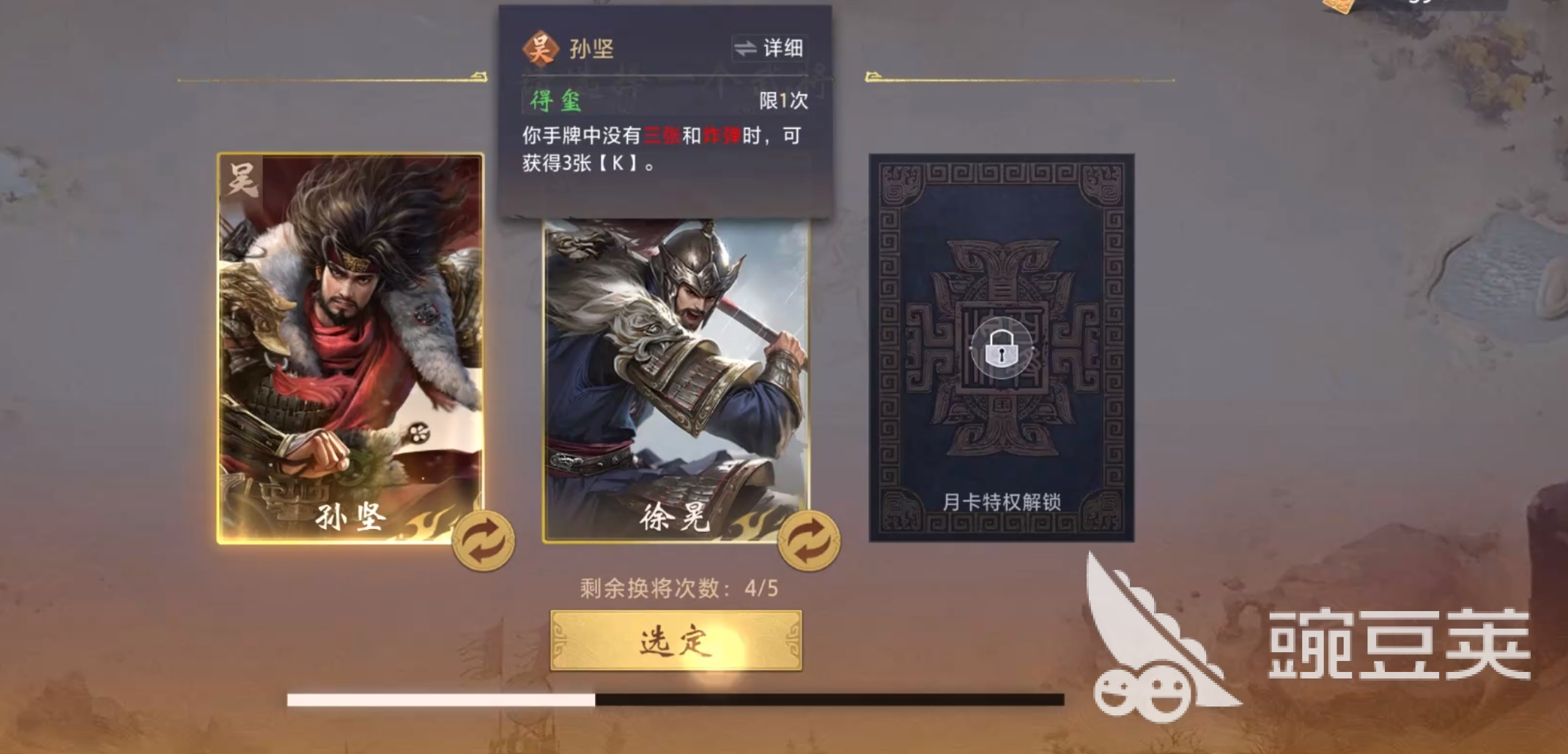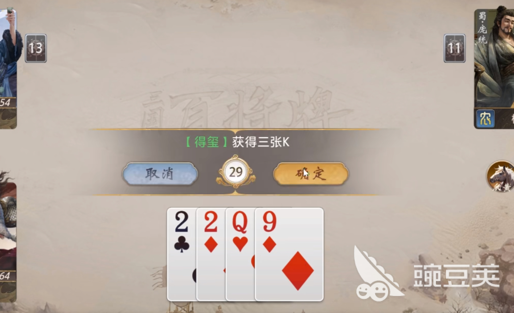 另外,在百将牌手游中,五星炸弹是可以克制王炸牌的,所以,当对局里存在孙坚时,我们就需要格外注意场上k牌的数量。如果到了清牌阶段场上仍有2张k牌还没有出现过的话,那么极有可能孙坚手上已经有五星炸弹了。所以孙坚是敌方对手的时候我们就需要尽可能多出对子或者是顺子,让孙坚的技能无法激活,或者是逼他打出手中的k牌,至少不要让他凑成五星炸弹的牌型。如果孙坚是友方的话,那我们就要打配合,主动出三带,帮助孙坚快速处理手中的三带牌型,尽早激活他的“得玺”技能。