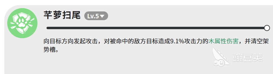 最后一个是芊萝扫尾,LV.5,向目标方向发起攻击,对命中的敌人造成9.1%攻击力的木属性伤害,并且清空架势槽。伤害本身不高,但清空架势槽这个效果很重要。架势槽清空之后,敌人会进入一段比较脆的状态,这时候接其他高伤害技能,效果会好很多。所以芊萝扫尾更多是当一个衔接技能来用,不是主要输出手段。