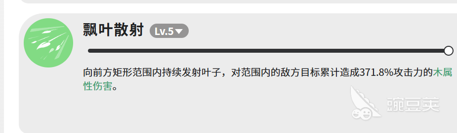 第二个技能叫飘叶散射,LV.5的时候,向前方的矩形范围内持续发射叶子,对范围内的敌人累计造成371.8%攻击力的木属性伤害。这个技能的伤害数值在三个技能里算是最高的,而且是范围攻击,打群怪的时候用起来很舒服。矩形范围意味着覆盖面比较直,打正面的敌人效果最好,侧面的可能会漏掉一些,用的时候注意一下站位。