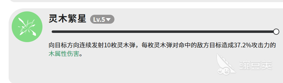 第三个技能是灵木繁星,LV.5,向目标方向连续发射10枚灵木弹,每枚造成37.2%攻击力的木属性伤害。10枚全打中的话,总伤害是372%,和飘叶散射差不多,但这个是单点集中输出,打单个目标的时候更合适。如果敌人会移动,可能会有几枚打偏,所以最好在敌人比较稳的时候用,命中率会高一些。