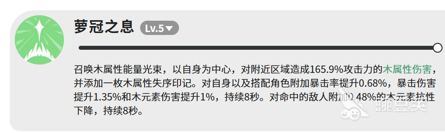 先说第一个技能,萝冠之息,满级也就是LV.5的时候,它会召唤木属性的能量光束,以自己为中心向周围打出去,伤害是165.9%攻击力的木属性伤害,同时还会加一枚木属性失序印记。这个技能的附加效果也不少,对自身和搭配的角色都能加暴击率0.68%、暴击伤害1.35%、木元素伤害1%,持续8秒。被打中的敌人还会掉0.48%的木元素抗性,同样持续8秒。单看数字可能觉得加成不算特别高,但叠起来用还是有感觉的,尤其是木元素抗性下降这个效果,配合队伍里其他木属性输出会更明显。