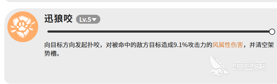 迅狼咬这个技能有点特殊,它的伤害本身不高,只有攻击力的9.1%,但它有一个很实用的效果,就是命中敌人之后会直接清空对方的架势槽。架势槽清空之后敌人会进入硬直状态,这时候接其他技能打伤害会更顺畅。所以这个技能更多是当控制用的,不是拿来打主要伤害的。