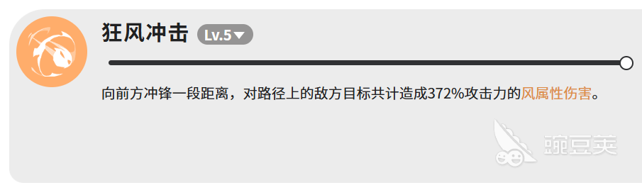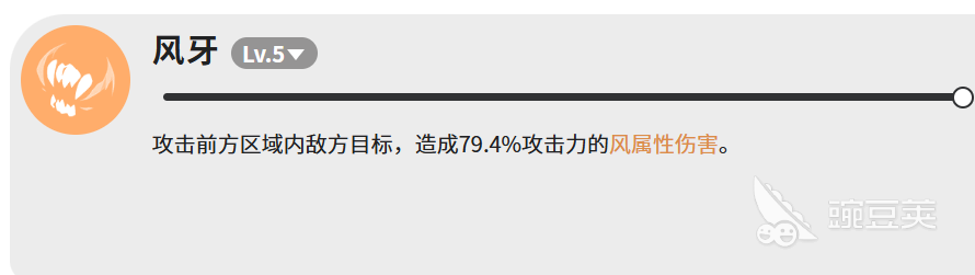风牙相对来说是个比较普通的攻击技能,攻击迅狼前方区域内的敌人,造成攻击力79.4%的风属性伤害。范围不算大,但胜在稳定,可以用来补刀或者接在其他技能后面用。