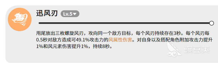 先说说它的技能,总共有四个,每个用途都不太一样。迅风刃是迅狼的核心输出技能之一。用这个技能的时候,迅狼会甩动尾巴,一口气甩出三枚螺旋形的风刃,三枚都打向同一个目标。每枚风刃放出去之后会在原地停留3秒,在这3秒里,每隔0.5秒就会对敌人造成一次伤害,伤害量是攻击力的49.1%。三枚风刃同时存在的话,伤害叠加起来还是挺可观的。除了伤害之外,这个技能还有一个附加效果,就是给迅狼自己和队伍里搭配的角色各加1%的攻击力和1%的风元素伤害,持续时间是8秒。虽然加成数值不算高,但打输出的时候能稍微补一点。