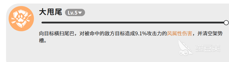 大甩尾同样是Lv5,动作是横扫尾巴打向目标,命中之后造成9.1%攻击力的风属性伤害。伤害本身很低,但这个技能有个额外效果——清空架势槽。这个才是重点,在需要打断敌人架势的时候,大甩尾就派上用场了。