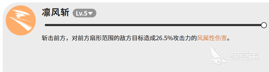 凛风斩也是Lv5,这个技能是斩击前方,攻击范围是前方的扇形区域,对范围内的敌方目标造成26.5%攻击力的风属性伤害。伤害倍率比较低,但胜在能打到一片,适合敌人比较密集的时候用。