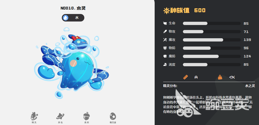 接下来为大家推荐的就是水灵,水灵同样也是大家可以在前期御三家里面选择的初始精灵,它需要靠后期进化来获取,前期如果大家在3小只里面选择到水蓝蓝的话,后期可以给它进行进化获取啵啵啦以及水灵,那么水灵在这里就是它3次进化以后得到的最终体,在这里性格上面它也是比较需要魔攻能力的,所以推荐大家可以给他适配保守、冷静这两个性格,这两个性格主要带来的都是有魔攻的加成,它额外带来的还有物攻加成,冷静性格的话则是在速度效果上面进行提升,所以水灵可以达到的种族数值也是比较高的,有658点的基础数值,后期通过浸润这个特性,它可以让自身在使用水系技能效果之后保证自己能耗的减少,所有的技能能耗都会减掉一点,所以它的费率相对来说比其他的精灵都要少一些。