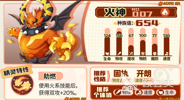 第三个为大家介绍的就是火神,火神也是前期通过初始精灵火花来进化达到的一个精灵,只要它进化成火神的话,那么在自身的一个输出数值上面,就会有一个非常高的数值可以利用起来,火神在这里相对其他的精灵来说,目前更适配的性格会比较少,只有固执和开朗这两个性格比较适合,因为火神在需要魔攻的时候,这两个性格能够给它带来同类效果的提升,而在特性能力上面,火神可以用到的能力就是助燃,这个能力会让它在使用了一些火系技能效果之后,自身会得到攻击效果上面增加20%的提升,而且这里的攻击能力不管是魔攻还是物攻都是会同样增加20%的,放在这里用的话,它绝对是火系当中非常强势的一个精灵。