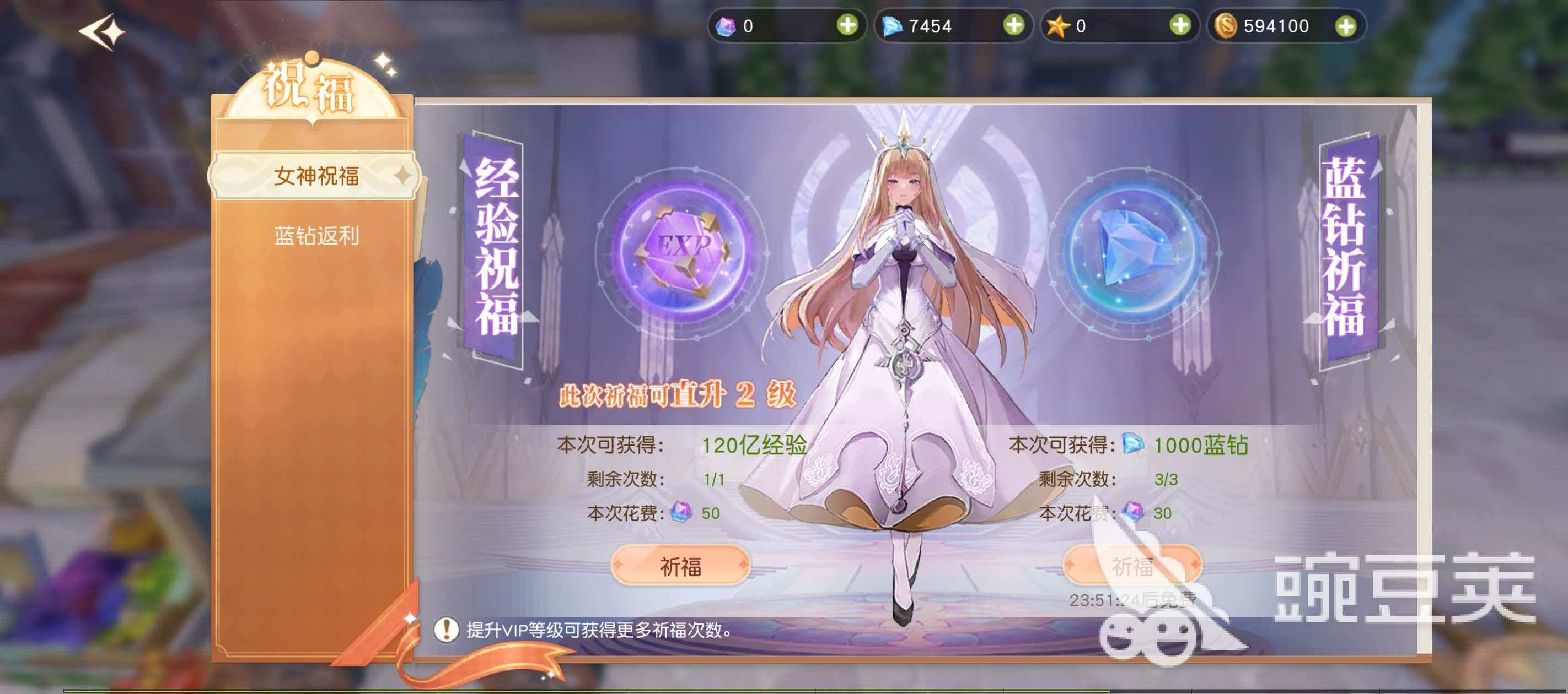 星神纪元中并没有天使祝福这个玩法,在这里只有女神祝福玩法,玩家登录星神纪元游戏界面以后,会在右上角的活动商城等众多标识中看到女神祝福的标识,打开这个标识就会进入到祝福界面,女神祝福界面中有两种祈福的方式,分别是免费祈福河使用彩钻祈福,免费祈福和彩钻祈福每天都只能进行1次,免费祈福可以获得1000个蓝钻,彩钻祈福则可以让本次祈福直升2级,也就说玩家在彩钻祈福中所获得的经验足足有120亿,需要花费的彩钻数量为50彩钻。