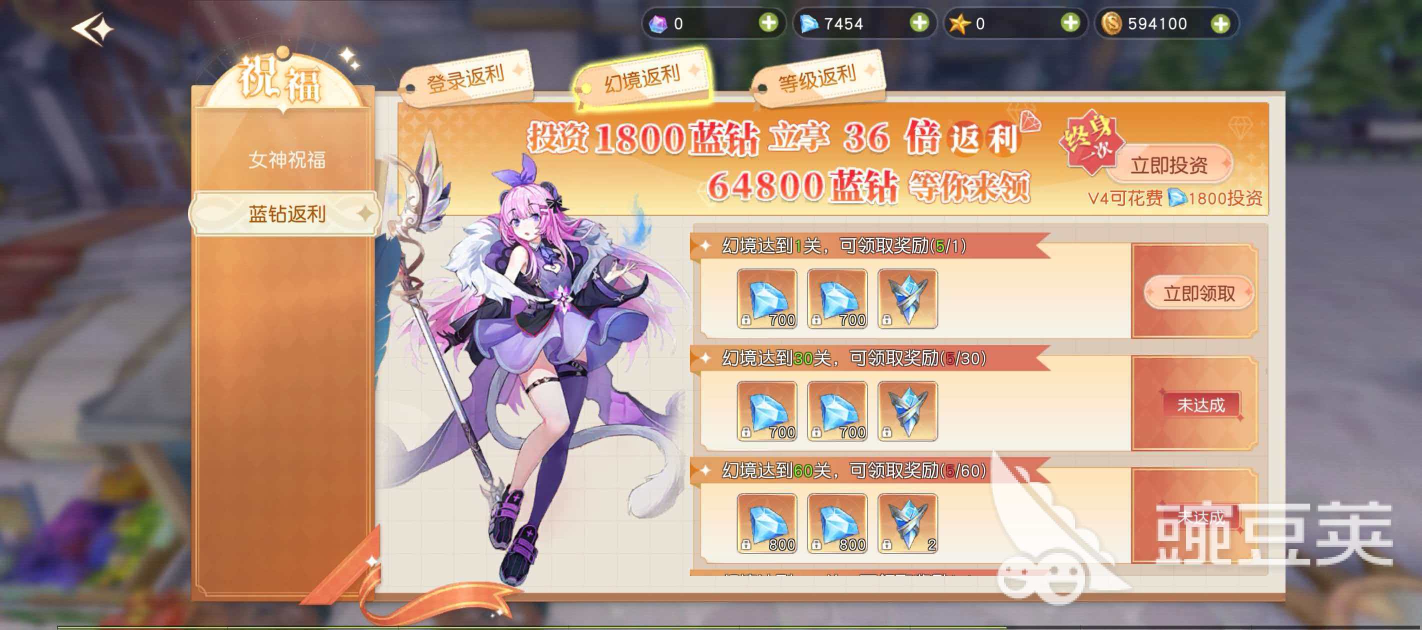 在看了解女神祝福这个玩法以后,小编在给大家介绍一下女神祝福下面的蓝钻返利内容,蓝钻返利玩法需要玩家先进行投资才行,在蓝钻返利中一共有登录返利、幻境返利和等级返利三个内容,登录翻录就只要玩家投资600个钻石,就能够享受到15倍的高额返利哦,能一共领取的9000蓝钻,不过需要玩家通过累积登录的方式来领取,幻境返利需要vip等级到了4以后以后才能投资,投资1800个蓝钻可以享受36倍的返利,一共可以领取64800个蓝钻,以幻境闯关的方式来领取,玩家闯幻境,只要到领取的关卡限制就能拿到返利,等级返利则是一个玩家只能享受到一次的终极返利投资,玩家只要花费3000个钻石就能够享受120倍的终极返利,能够获取的蓝钻数量足足高达36000个。
