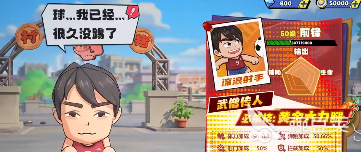 前锋线是整套战术体系的核心输出端。首推角色为【武僧传人】——该球员在体力与弹跳属性上拥有显著加成,不仅保障持续跑动能力,更大幅提升射门起跳高度与滞空时间;其主动技能“黄金大力腿”可显著增强射门力量与球速,令防守方难以预判拦截,长期培养价值突出,是平民玩家前期必练的关键输出点。