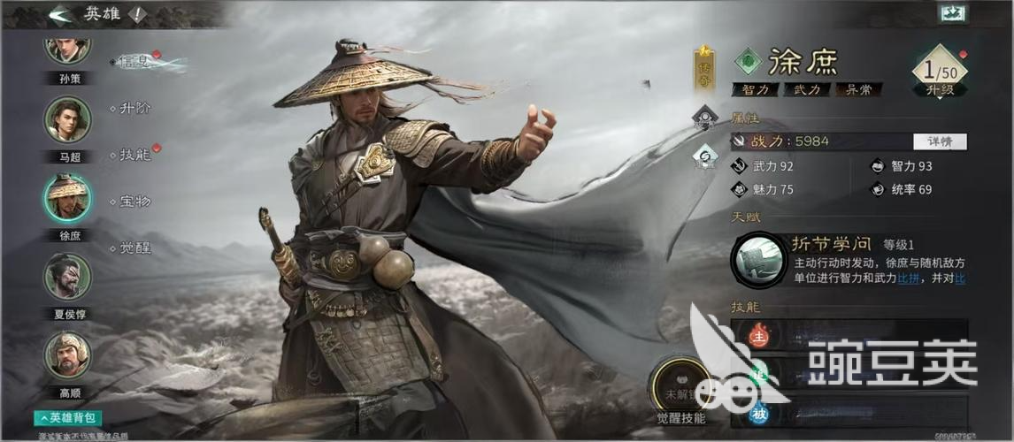 徐庶的天赋折节学问可以让他在主动进行行动时和敌军展开智力和武力上的比拼,每当徐庶胜利一次会会对敌人造成高额的伤害,徐庶这个武将的核心主要时在比拼给敌人造成伤害时会附加上技穷的效果,让敌人的智力在受到伤害的同时还能够施加上牵制的效果。