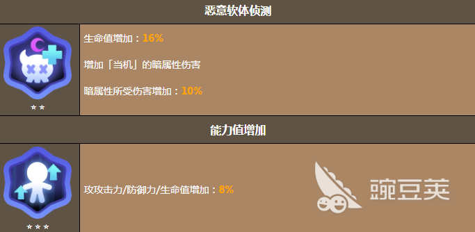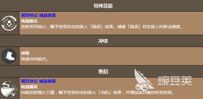 从二星到五星,每一次的升级都会让这位特工的实力可以更上一层楼。二星解锁恶意软体侦测,生命数值提升的同时,可以强化带来的暗属性伤害。让暗属性输出会更有震慑力,三星全属性小幅度提升之后,攻防血的均衡增长,让它在战场上会拥有更好的续航能力。四星解锁版本更新之后,防御力还会大幅度的提升电流爆发,还有电流炮击的伤害就可以直接增加25%技能的威慑力是很不错的。看似很完美的他也有一些小软肋,这位时刻保持挺拔站姿的特工,一旦遇到计划外的突发情况,就会像突发故障的机器人一样,直接愣住。