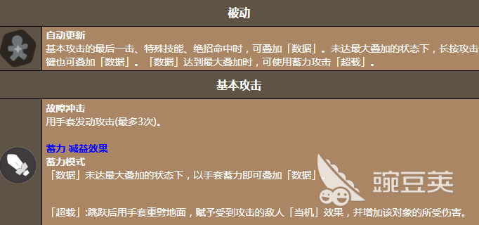 这就是精准的打击型战士,手套是他的武器,数据就成为了底气。基础攻击主要是以手套接连发动三次猛烈攻击,让他的战斗会充满策略性。只要基本攻击最后一击,那么特殊技能就可以直接叠加数据,没有达到上限时长直接按攻击键,照样也可以稳定的去积攒数据能量。当数据叠满的一瞬间,蓄力攻击就会应声而出,跳跃重劈地面的一瞬间,就会让敌人陷入到困境中。而且还会放大所受到的伤害,让每一次的蓄力都会成为破局的关键。
