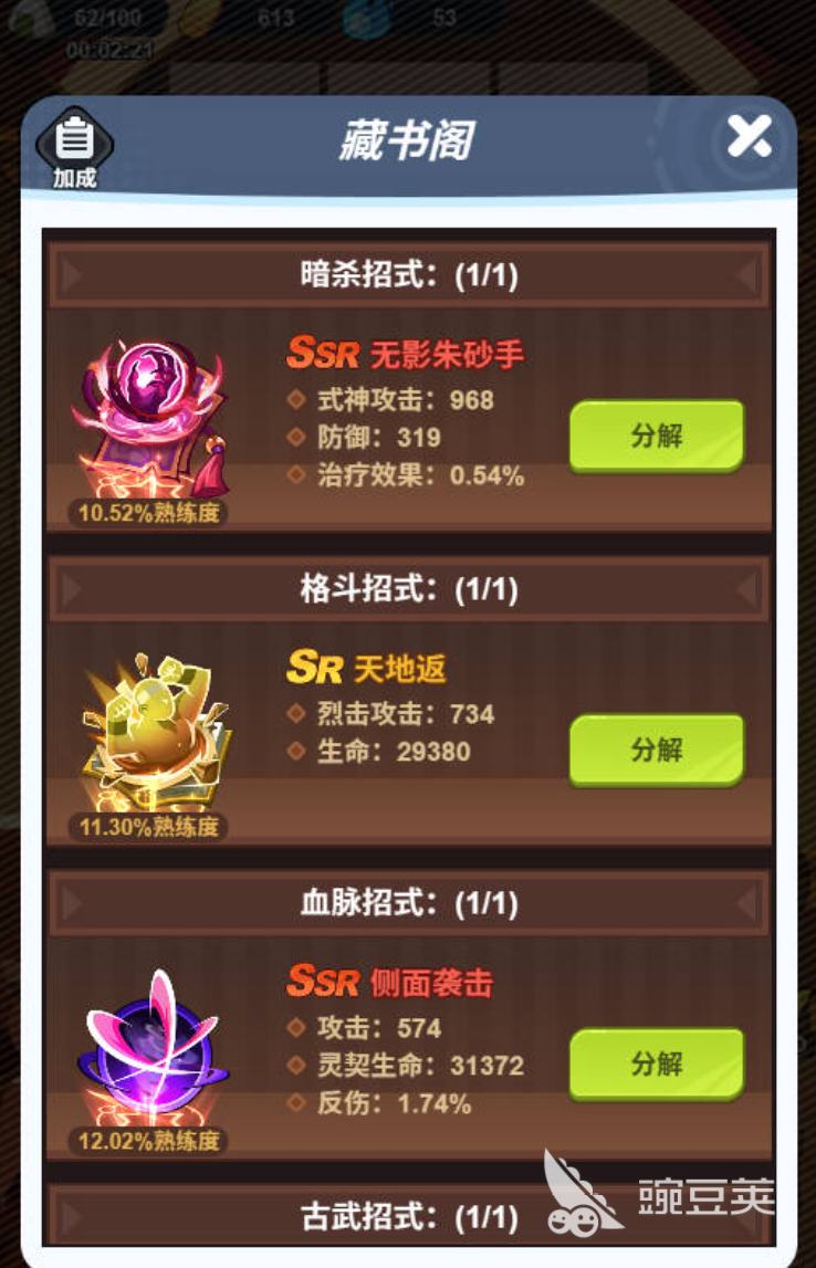 玩家在选择体验武馆的时候,主打的就是偷师学招式。玩家来到这里,每次将会消耗一个饭团,这时候只能够尝试一次,如果成功的话,就能够随机拿到暗杀、格斗、血脉、古武这四类招式。当然玩家也有机会,可能会面临失败,一旦失败之后将会什么都没有。一旦玩家拿到这些招式之后就能够直接装配在藏书阁,从而就能够给自己手中的角色增加攻击防御以及暴击。如果玩家碰到的是不需要使用的招式,建议玩家直接分解,不要让他占位置。当玩家将这些招式分解之后,就能够获得古币。古币其实是提升藏书阁的核心材料。
