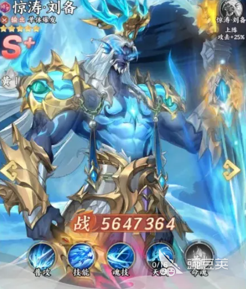 第一个大家可以选用的就是惊涛刘备,刘备在当前S+品质里面走单体爆发路线是非常强的,因为他带来的命魂强度是非常高的,技能效果当中带来的单点输出非常高,技能在释放之后,其实有一次机会是可以追加足够的普攻,这个效果目前游戏当中可以用的角色还是比较少的,而在怒气夺取的效果上面,其实是没有什么上限条件的,只要他的怒气数值是比较低的情况下,这里就可以快速的回怒,所以对于阵容要求来说,刘备要是可以有4星强度的话,这里的天赋对于队友需要的加成也是可以带一部分增益的,所以刘备就是回怒定位上非常强势的一个单体角色。